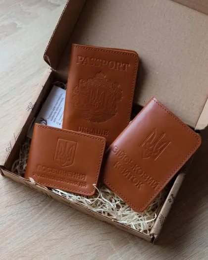 Подарунковий набір "Обкладинки на паспорт, військовий квиток, убд", коричневий.